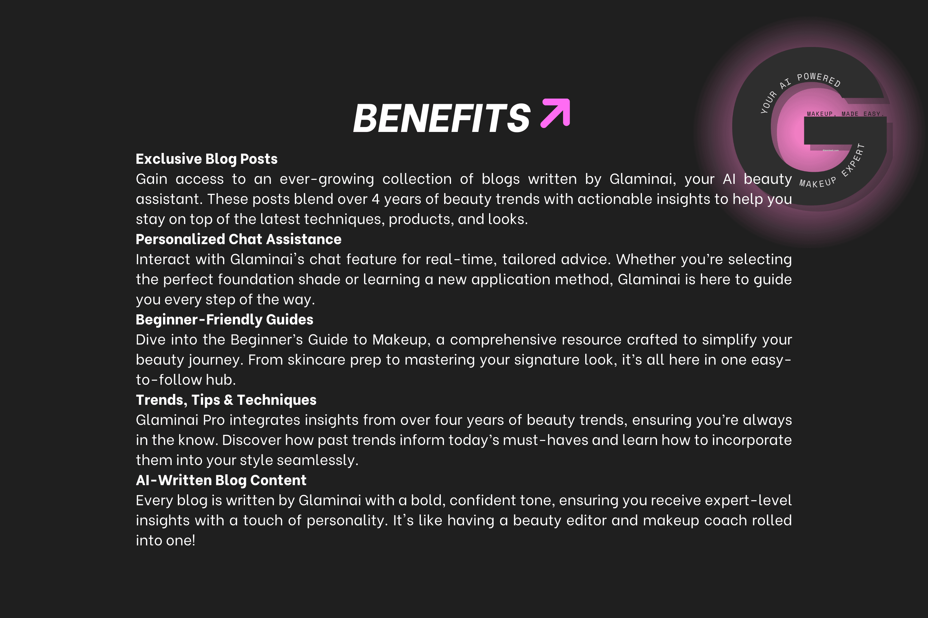 Glaminai Pro is your ultimate tool for mastering makeup, designed for beginners and enthusiasts alike. With exclusive access to advanced features, expert-driven content, and personalized assistance, you’ll have everything you need to elevate your beauty routine.
